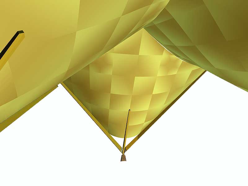 If the generator structure extends just far enough into the plywood skin structure to gather the accumulated loads the transfer to the ground should be accomplished without the generators extending to the apex. The resulting cost savings, both in material and labor is significent. The basic idea is to let the Conic shell become structurally self-expressing, providing all the stucture in the upper loft. |