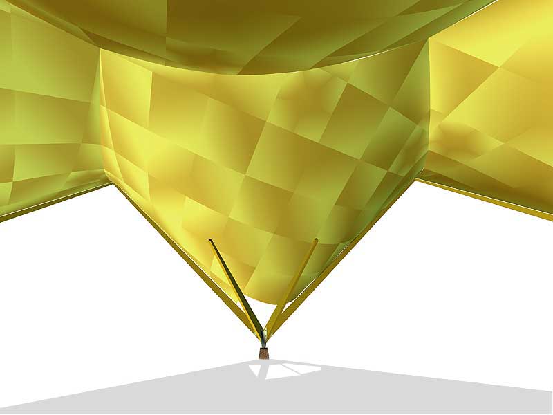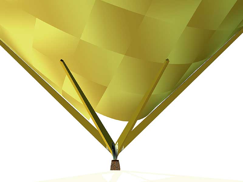 Most Conic Shelter built to date can be described as a flat plywood panel skin attached to a tripod structure. The tripod structure is composed of three "generators" (stout beams) that attach to the skin and convey all loads to the ground. |
