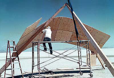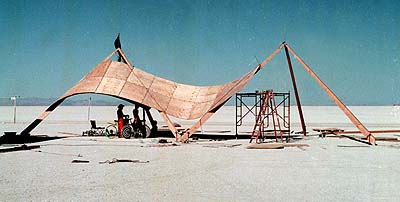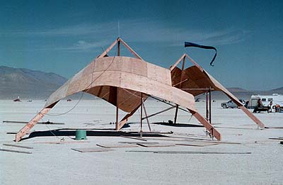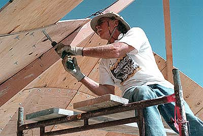 Richie Wasserman applies torc to the fastenning bolts from scaffold. Each ply sheet overlapped it's neighbors by 3". The 4'x4' sheets were positioned like hugh tiles to repel water should it rain during the Burning Man event. Carriage bots (1/4" in diameter) fastenned the ply sheets every 9 inches thus creating a hugh coninuous sheet of plywood. The bigger the sheet of plywood became the more willing it was to bend. |